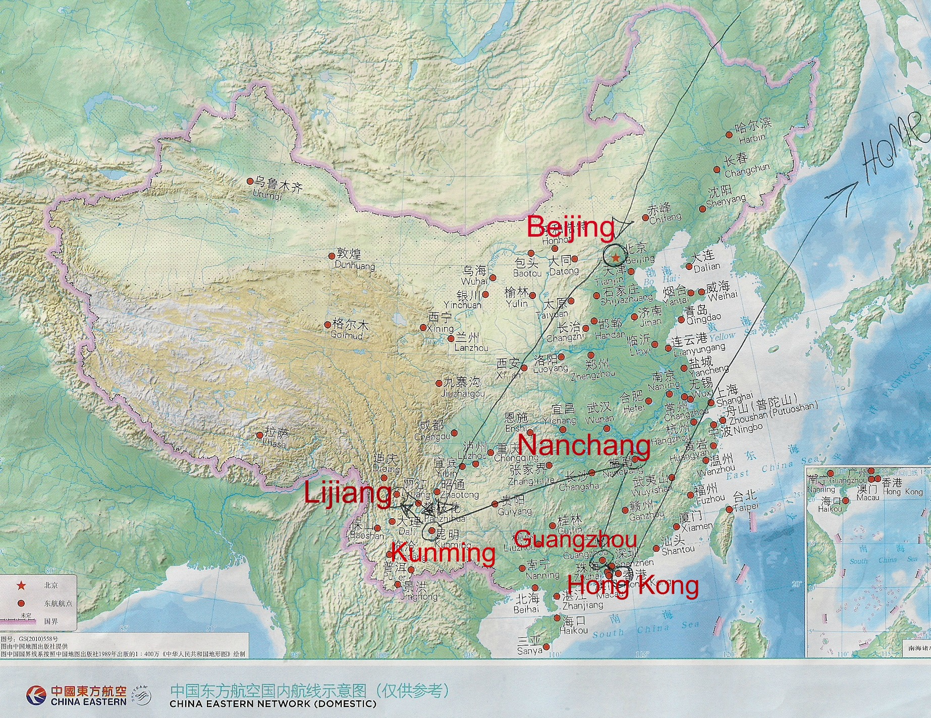 Seven-city tour of China: Beijing, Kunming, Lijiang, Nanchang, Xinyu, Guangzhou and Hong Kong. Xinyu is southwest of Nanchang.